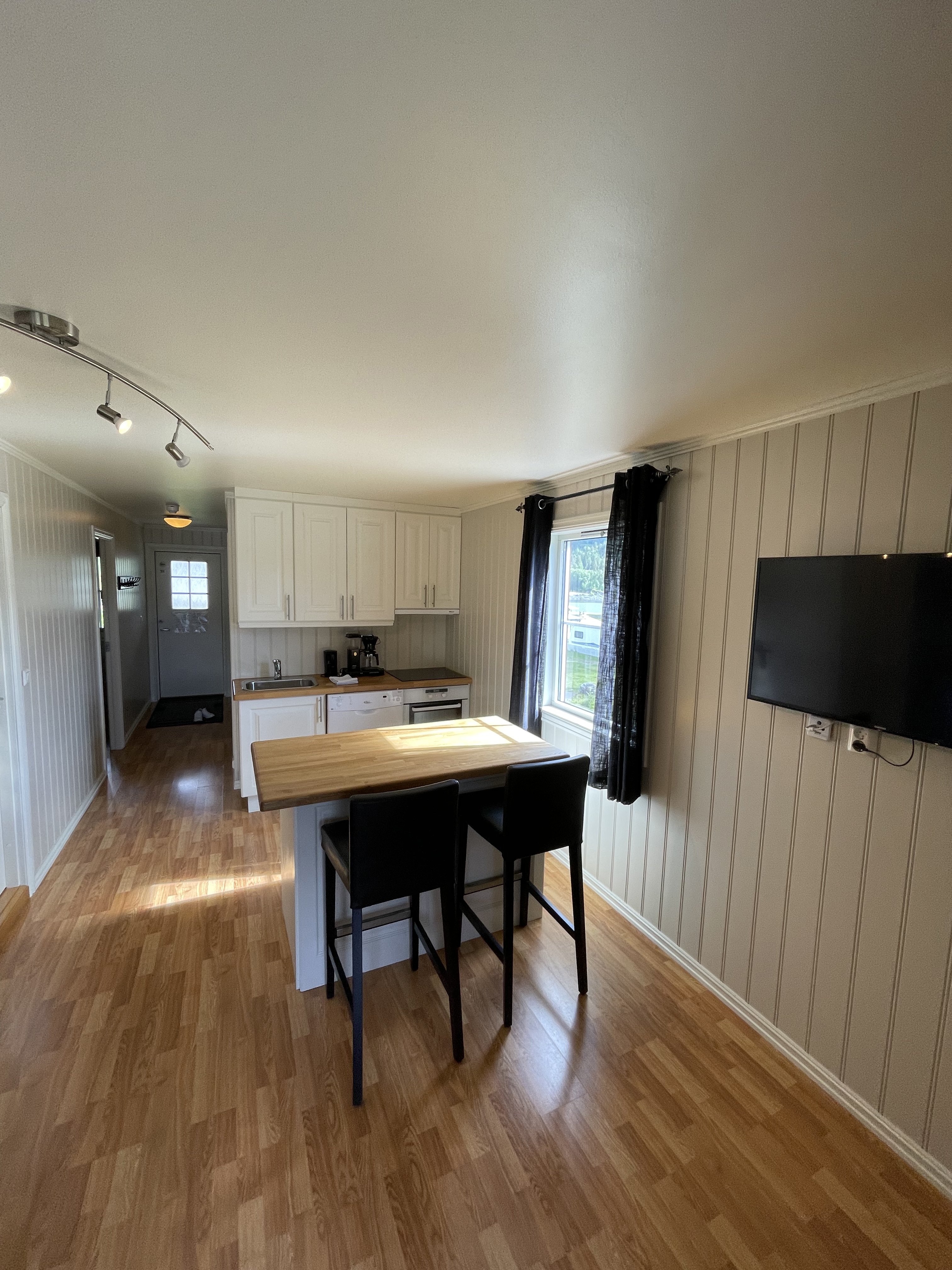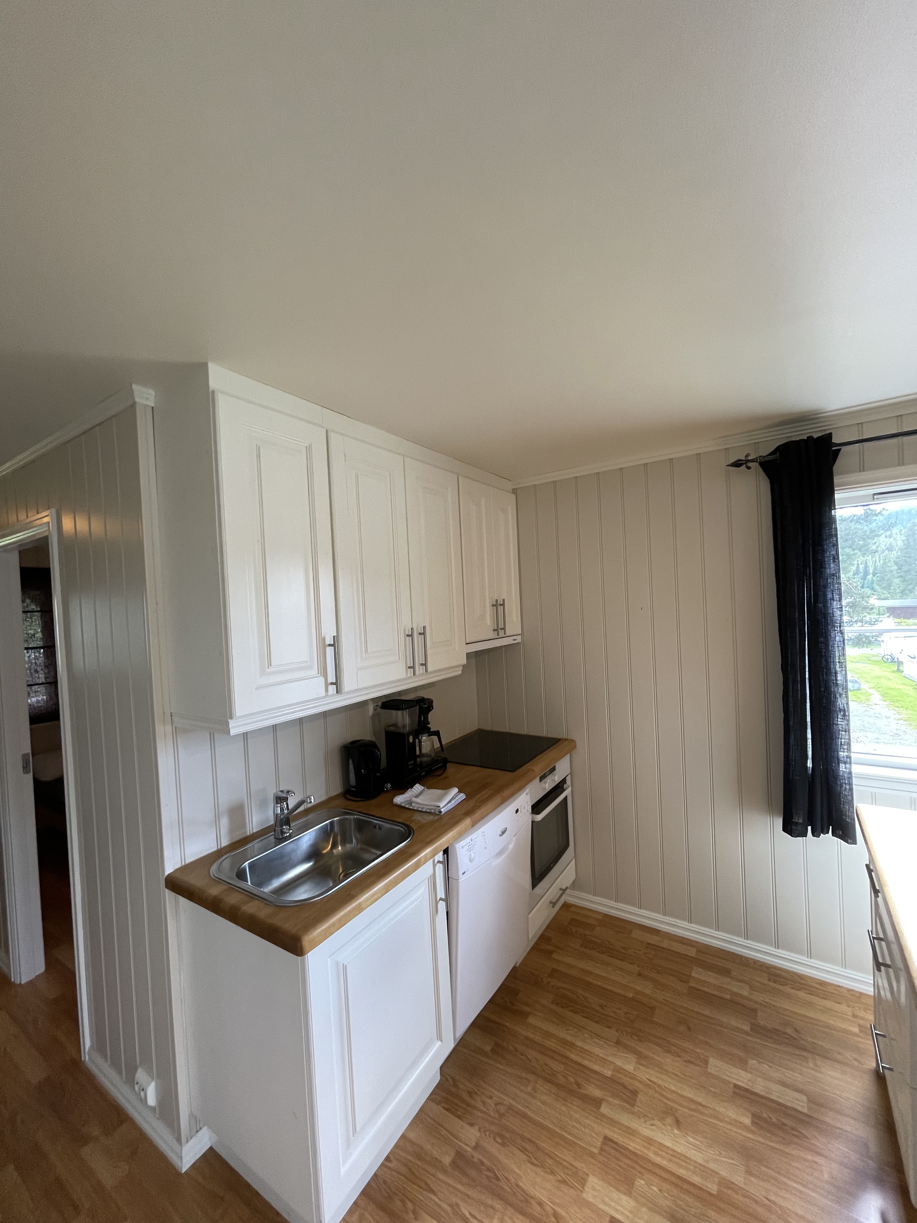 Moderne leiligheter med to avdelte soverom. Familekøyeseng på hvert rom med 6 sengeplasser. Kjøkken med komfyr, oppvaskmaskin, kjøleskap, kaffetrakter og vannkoker. Alt av dekketøy og kokekar. Dyner og puter. Bad med dusj, vask og WC. Støvsuger. Egen overbygd terrasse med utsikt utover Strandefjorden. Areal : 40 m2.